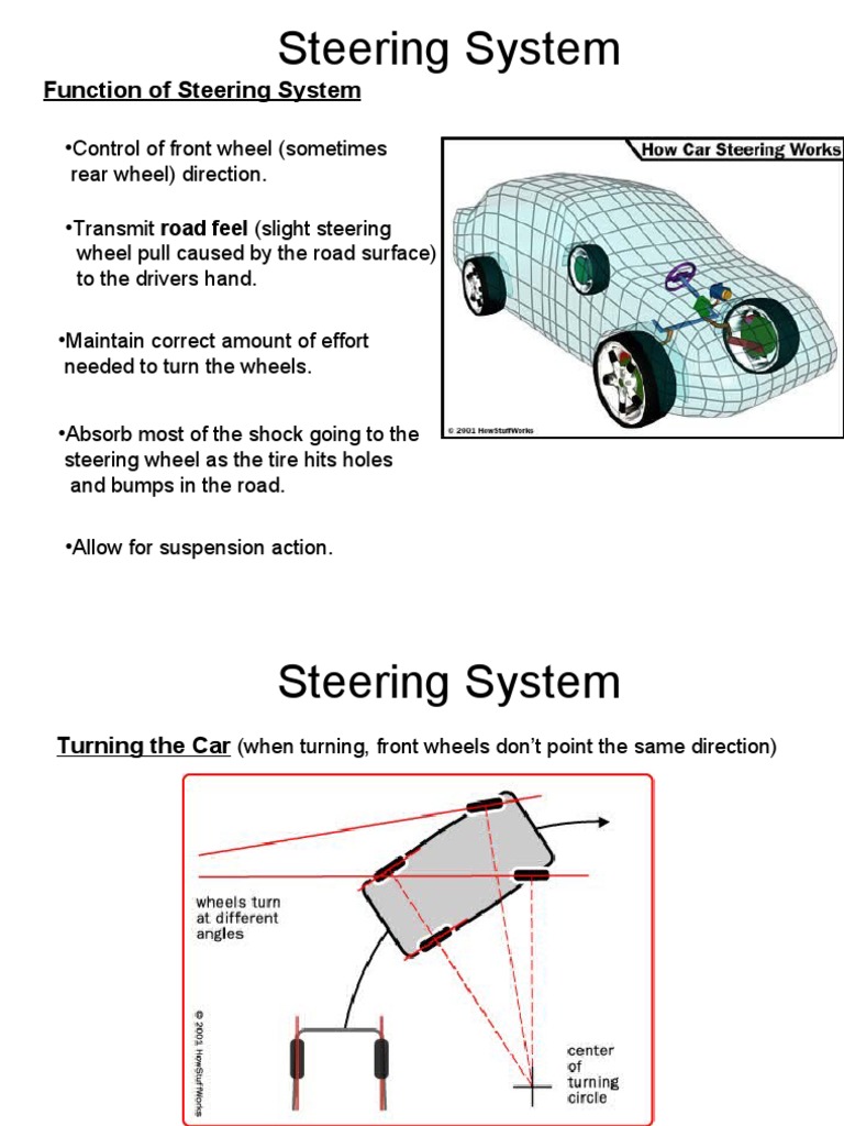 The components of the steering system also absorb some of the road shock before it gets to the driver. The steering system comprises multiple parts moving simultaneously containing universal joints main shafts intermediate shafts and the steering rack also known as the steering gearbox or steering box. The basic function of the steering system is to allow the driver to safely and precisely steer the vehicle. A group of parts called the steering system transmits the movement of the steering wheel down the steering shaft to move the wheels left and right although car wheels dont turn at the same angle. The important function of the steering system is as follows. The components of the steering system also absorb some of the road shock before it gets to the driver. Beyond this the steering system also provides a way to reduce driver effort by making the act of steering the vehicle easier.