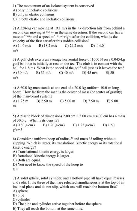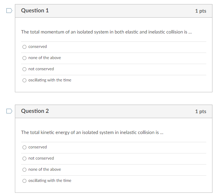 C The collision is said to be elastic if two bodies stick together after collision. In general relativity energymomentum conservation is not well-defined except in certain special cases. The law of conservation of momentum states that the total momentum of all bodies within an isolated system p total p1 p 2 is constant. As discussed in a previous part of Lesson 2 total system momentum is conserved for collisions between objects in an isolated systemThe momentum lost by one object is equal to the momentum gained by another object. The total momentum of an isolated system of objects remains constant. However losses of kinetic energy are negligible in the nearly elastic collisions between atomic particles and subatomic particles. Such a collision is called an elastic collision. In a closed and isolated system if there are two colliding bodies and the total kinetic energy is unchanged by the collision then the kinetic energy of the system is conserved it is the same before and after the collision. If we consider Earth to be an isolated system during the short time interval that the people jump up this approximation is appropriate then momentum must be conserved.